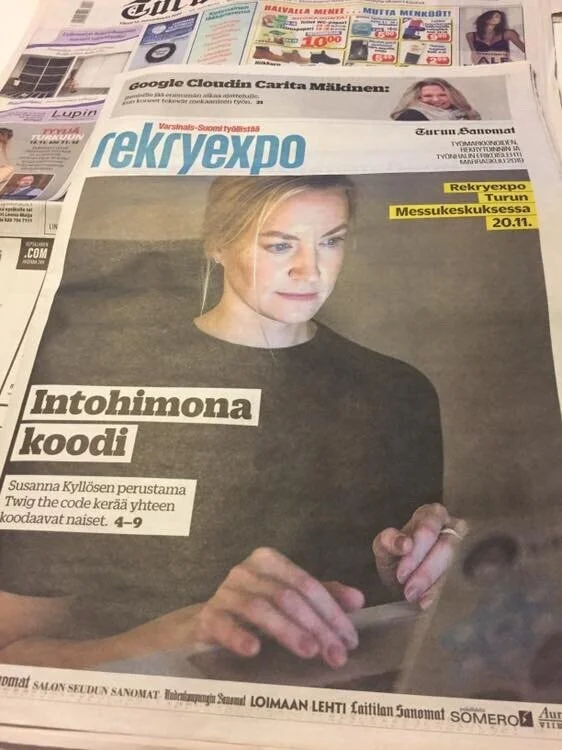 Viimeisimpänä, mutta ei vähäisimpänä, Turun Sanomat kävi tekemässä Twig the code:sta juttua rekryexpo-liitteeseen. Tämän jutun jälkeen yhdistyksemme jäsenmäärä lähti selvään kasvuun, mikä on ihan huikea juttu. Juttuun pääset käsiksi täältä: https://bit.ly/33mua5i